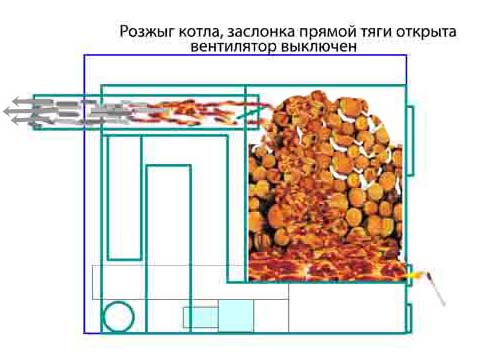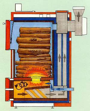 Топливо в виде дров или другого материала для горения закладывается внутрь колосника. После поджигания топлива и закрытия дверцы активируется дымососная система. По бесплатным чертежам пиролизного котла видно, что полученный дефицит воздуха и создавшаяся температура минимум двести максимум восемьсот градусов, образуют условия для обугливания топлива. От этого происходит выделение газа, который называют древесным. Такой процесс именуют словом пиролиз.