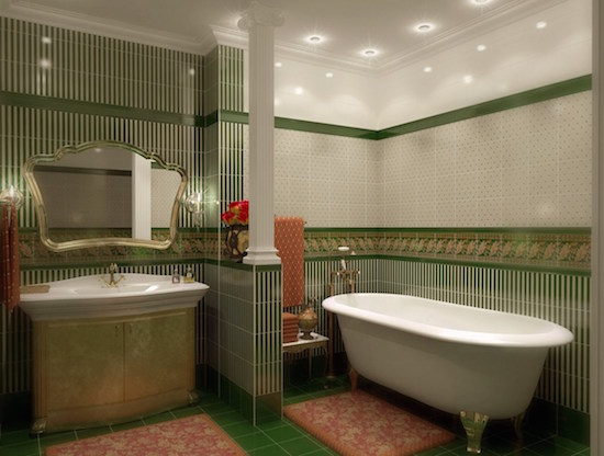 Многие хозяева предпочитают отделывать самые “страдающие” от влаги и износа места в ванной особыми материалами, которые могут похвастаться своими свойствами. Как правило, плиткой из латекса или винила отделывают зону под и над раковиной и ванной. Разнообразие их дизайна позволяет создавать роскошные и долговечные интерьеры в ванной комнате. К тому же, по подобию панелей из пластика, такая плитка помогает скрывать нервности и недостатки стен.